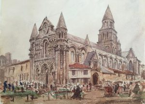 This is reproduced on page 104 of Architectural Studies in France. Typically architectural sketches give minimal context and colour, they are designed as a portrait of the building to present its character, or effect. Here the bustling market is integral to the position of this church, so it is shown but roughly so as not to distract.